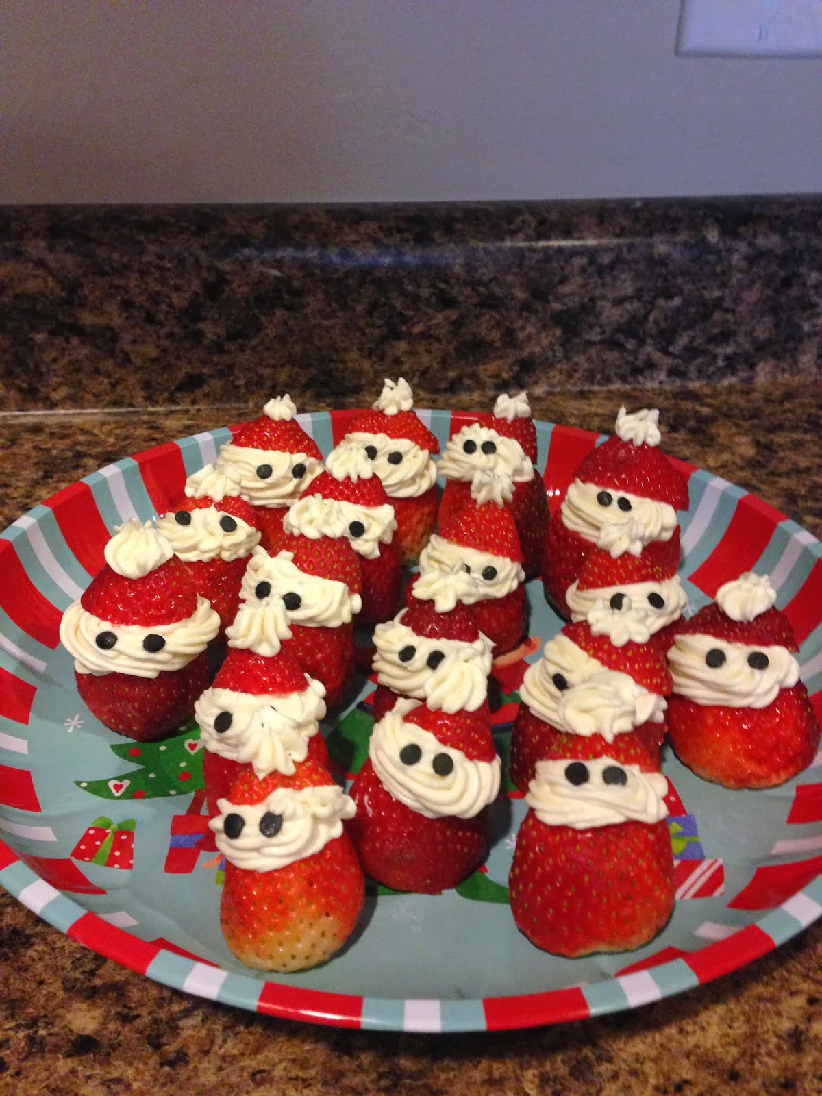 As most of you know, if my husband didn't know how to cook- we would starve. This year, I tried making a few snacks! I failed. Miserably. However, once Laura came to my rescue, it was smooth sailin'! We made chocolate dipped pretzels, and santas made out of strawberries and a cream cheese dip. They turned out cute! So cute, in fact, that I had a hard time eating them ;) They each looked like they had their own little personalities.